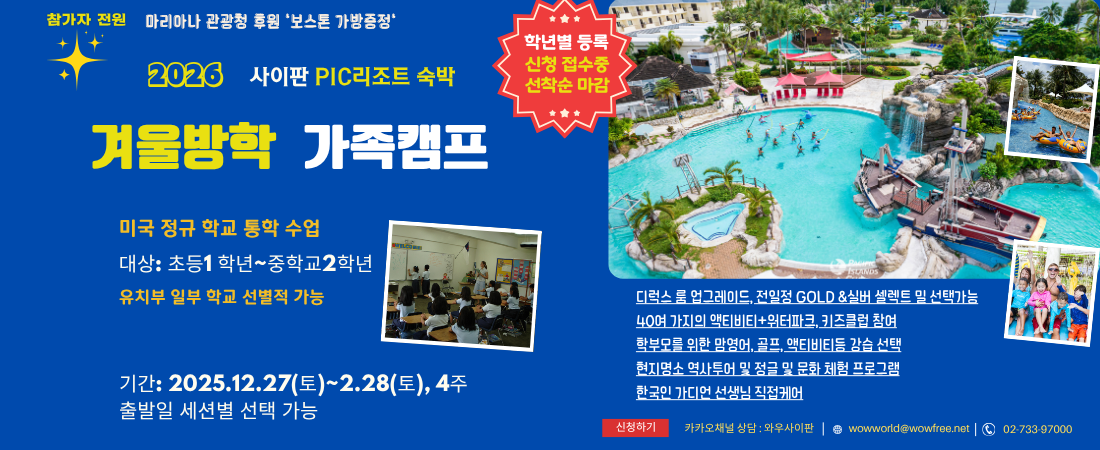 상담 및 예약신청 접수 → 유선 문의: 02-733-9700 / 카카오톡 채널: 와우사이판